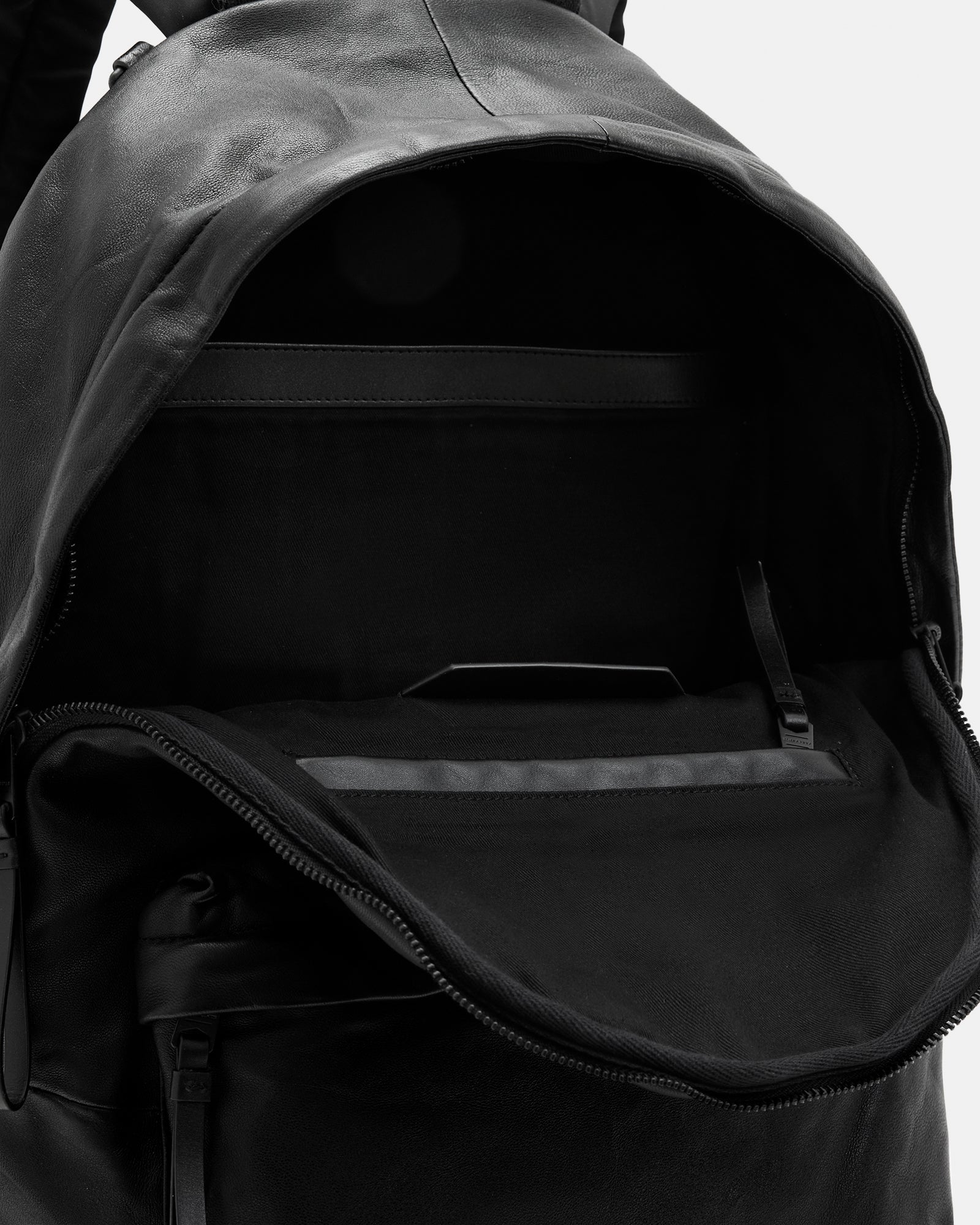 An everyday essential, the AllSaints way. This is the Carabiner Backpack. Made from smooth leather with lightweight straps. It has an embossed logo patch, with the removable carabiner clip as a finishing touch.