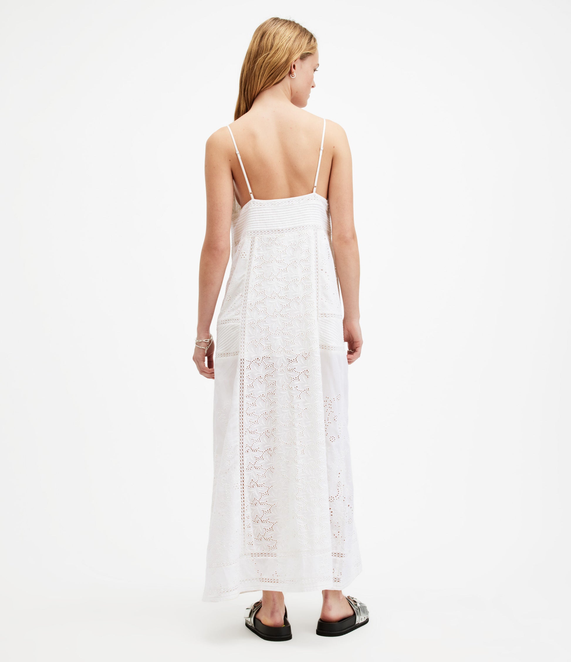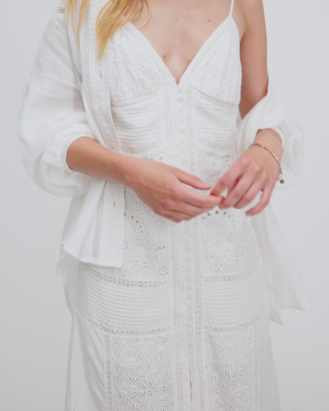DAHLIA embroidered mid-length dress is made of rayon blended fabric, with detailed embroidery and front slit design. It is elegant and personal, perfectly echoing the design theme of this series.