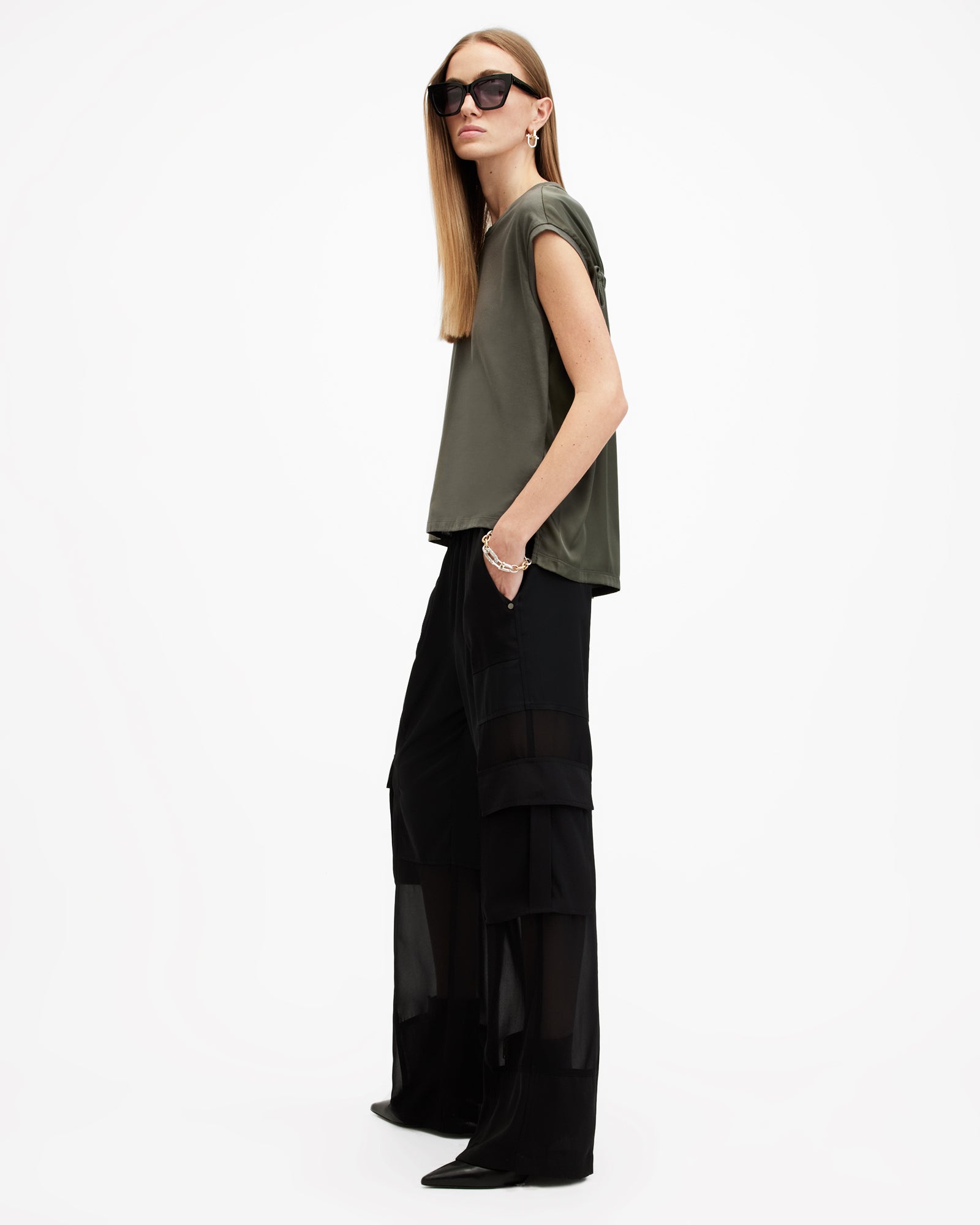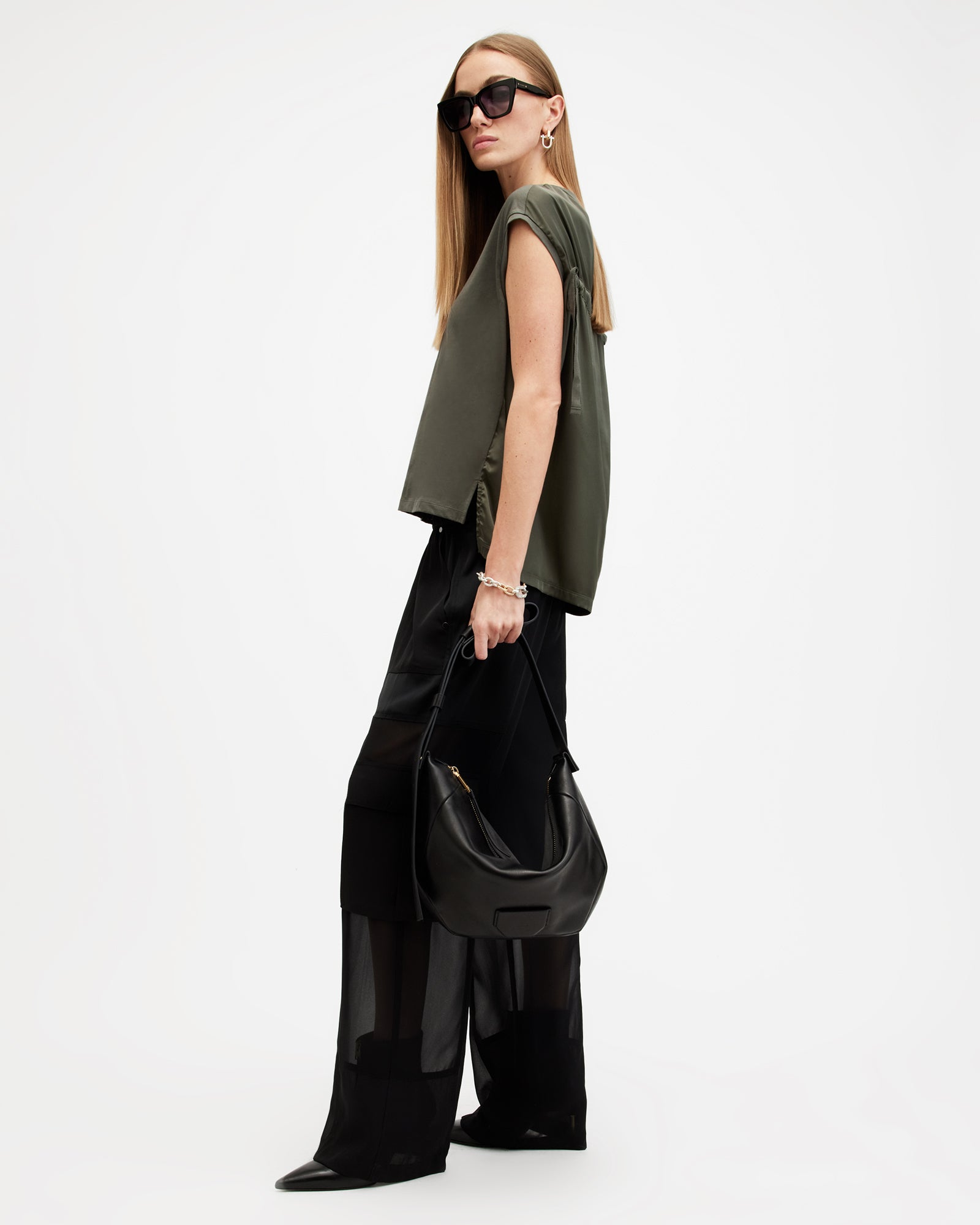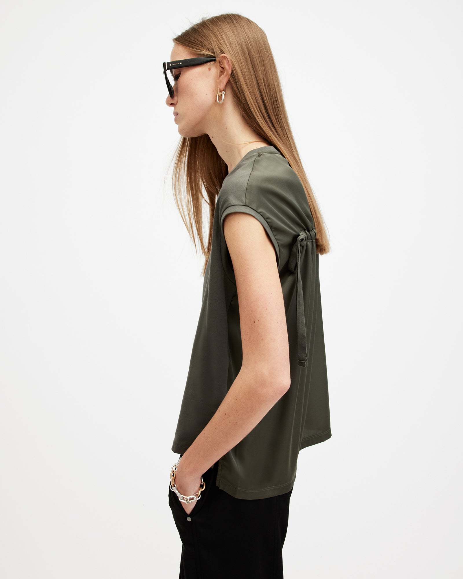 Simple statements look like this. The Kalma Top is an easy crew neck shape made from two contrasting panels. Lightweight jersey at the front and satin on the back. Across the back, a grosgrain drawcord gives adjustable shaping to the back and sleeve edges. This is your elevated option for casual dressing.