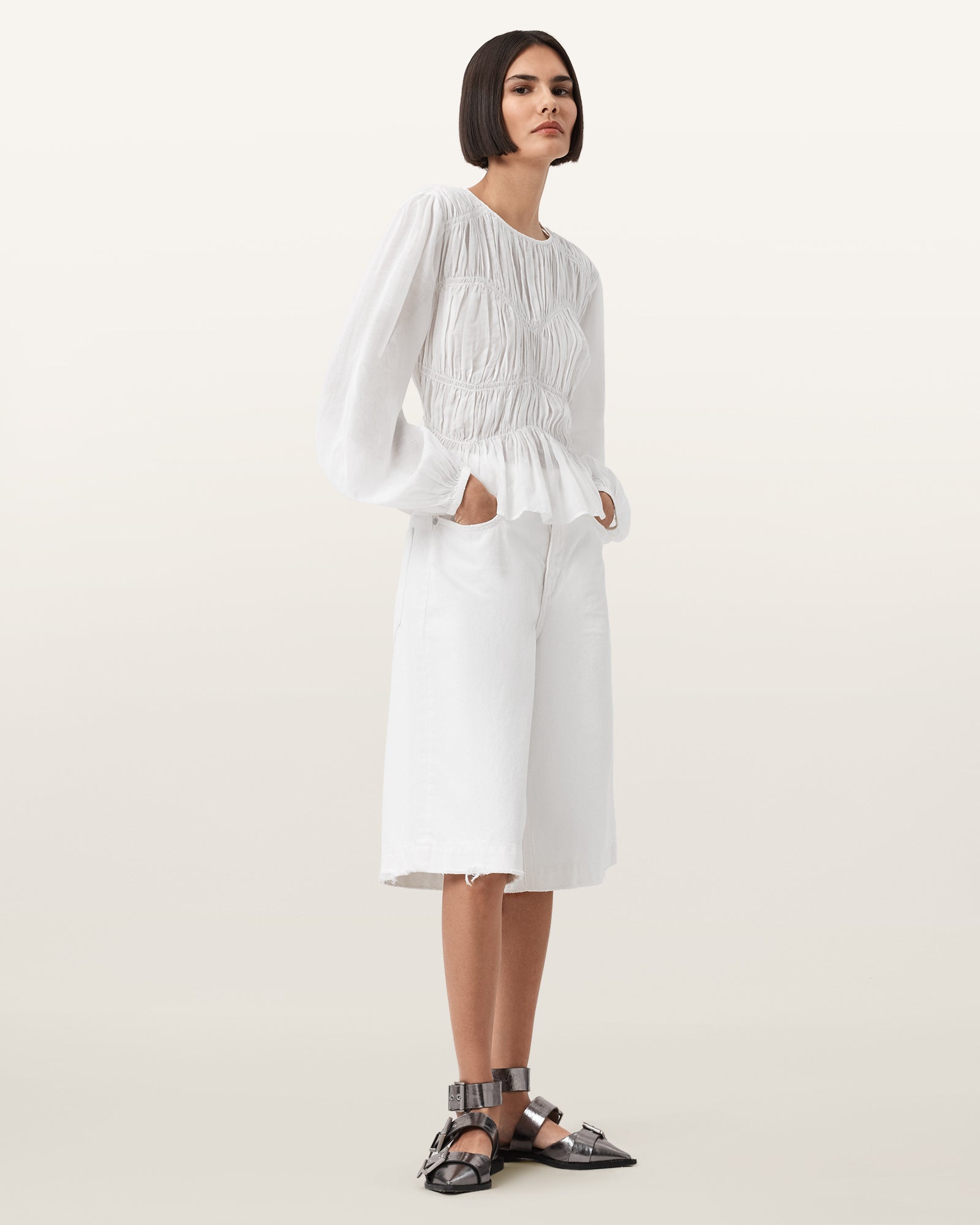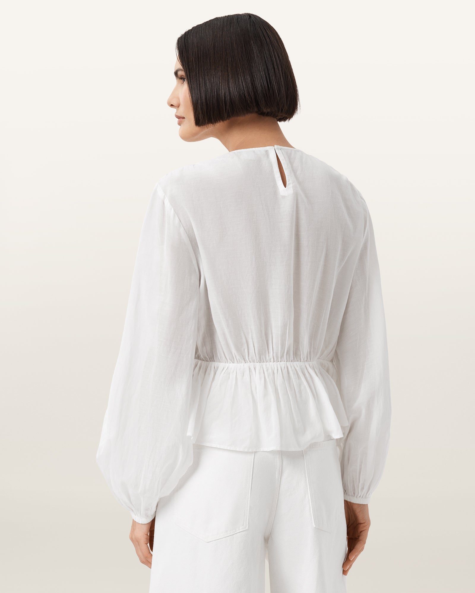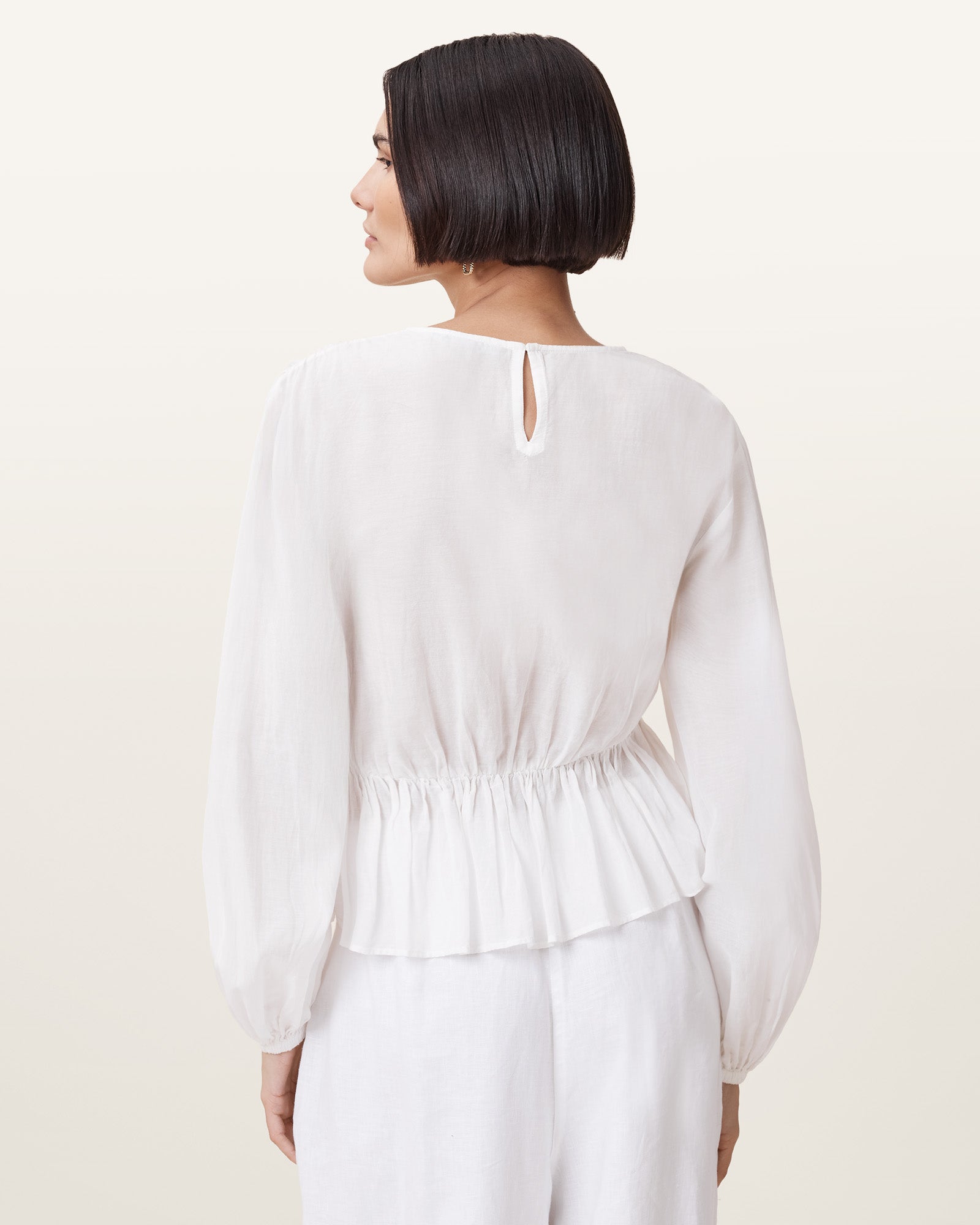 There's a distinct feminine feel to our Melani Top. It's designed with a gathered front and a subtle peplum hem. Note the puff sleeves and elasticated cuffs too. Style it with the tulip skirt - that's the full look.