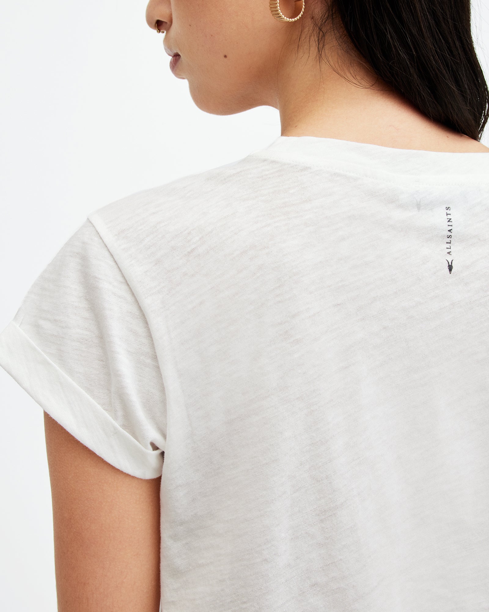 An easy piece, this is the Anna T-Shirt. Crafted from soft cotton, it's shaped to a regular silhouette. Featuring turned-up cuffs and our AllSaints signature on the back of the neck.